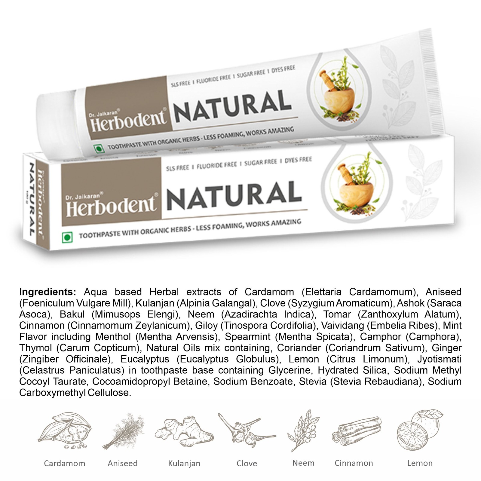 - Ingredients: Aqua based Herbal extracts of Cardamom, Aniseed, Kulanjan, Clove, Ashok, Bakul, Neem, Tomar, Cinnamon, Giloy, Vaividang, Mint Flavor including Menthol, Spearmint, Camphor, Thymol, Natural Oils mix containing, Coriander, Ginger, Eucalyptus, Lemon, Jyotismati in toothpaste base containing Glycerine, Hydrated Silica, Sodium Methyl Cocoyl Taurate, Cocoamidopropyl Betaine, Sodium Benzoate, Stevia, Sodium Carboxymethyl Cellulose.